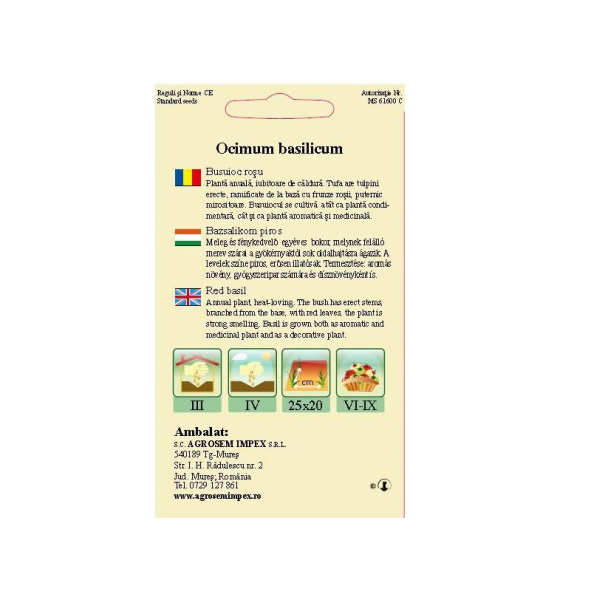 Specificatii tehnice Adancime 1 cm Insamantat incepand cu luna februarie-martie Tipuri de productie din seminte, din rasad Generalitati Greutate 1 gram Plantare aprilie-mai Recoltare iunie-octombrie Vegetatie 120 zile Denumire ştiinţifica: Ocimum basilicum var. purpurascens, familia Lamiaceae.